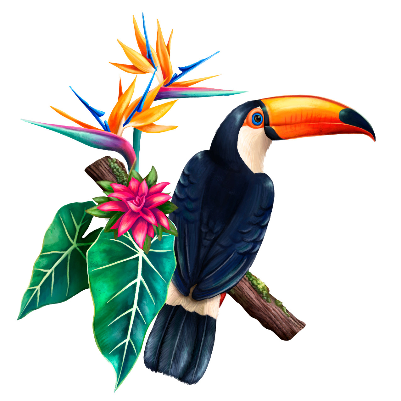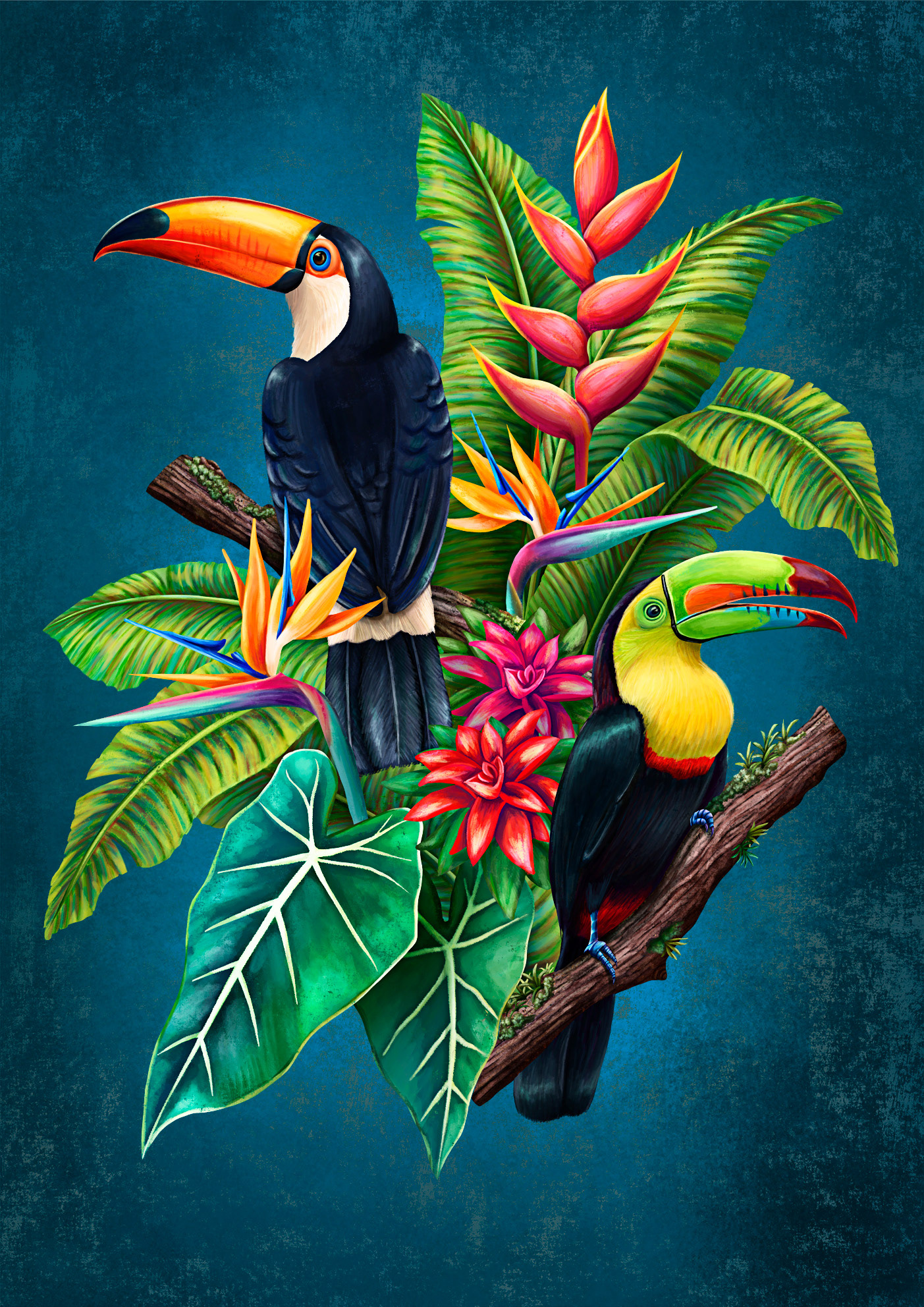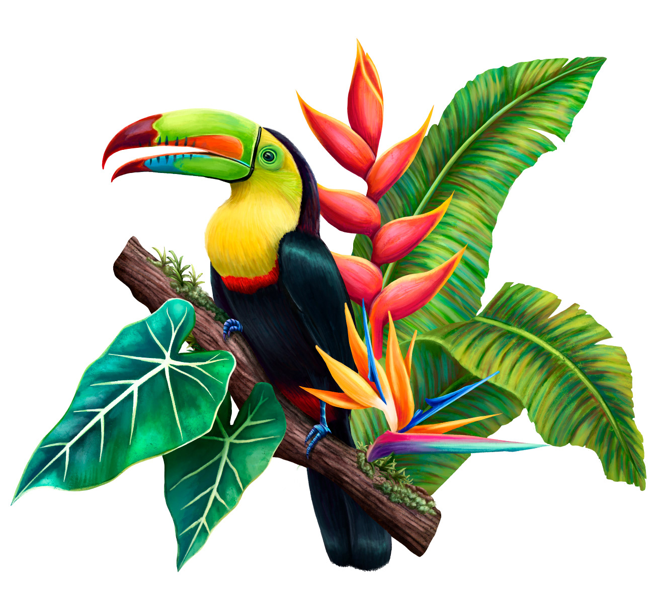 In the image you see a Toco-Toucan (orange beak), a Killed-Billed Toucan (green beak). Flowers are: Heliconia, bromeliads, bird of paradise. Foliage are: Alocasias and Heliconia leafs.