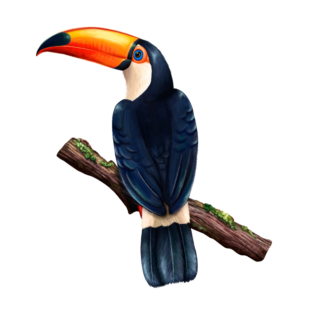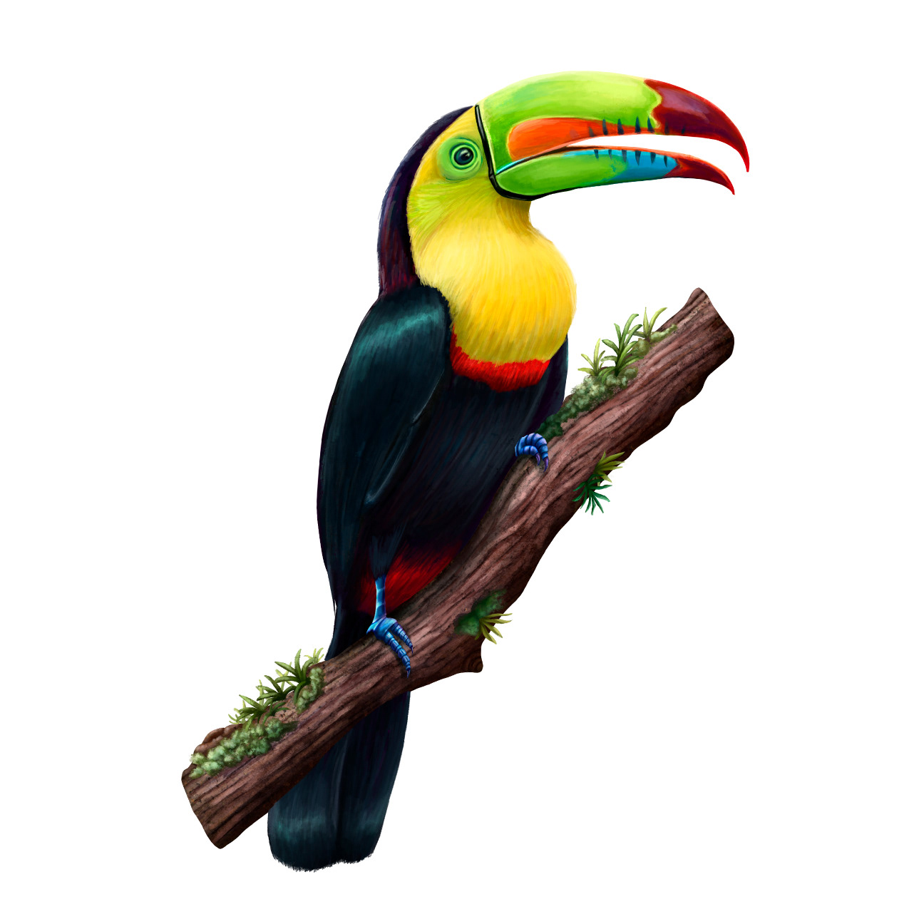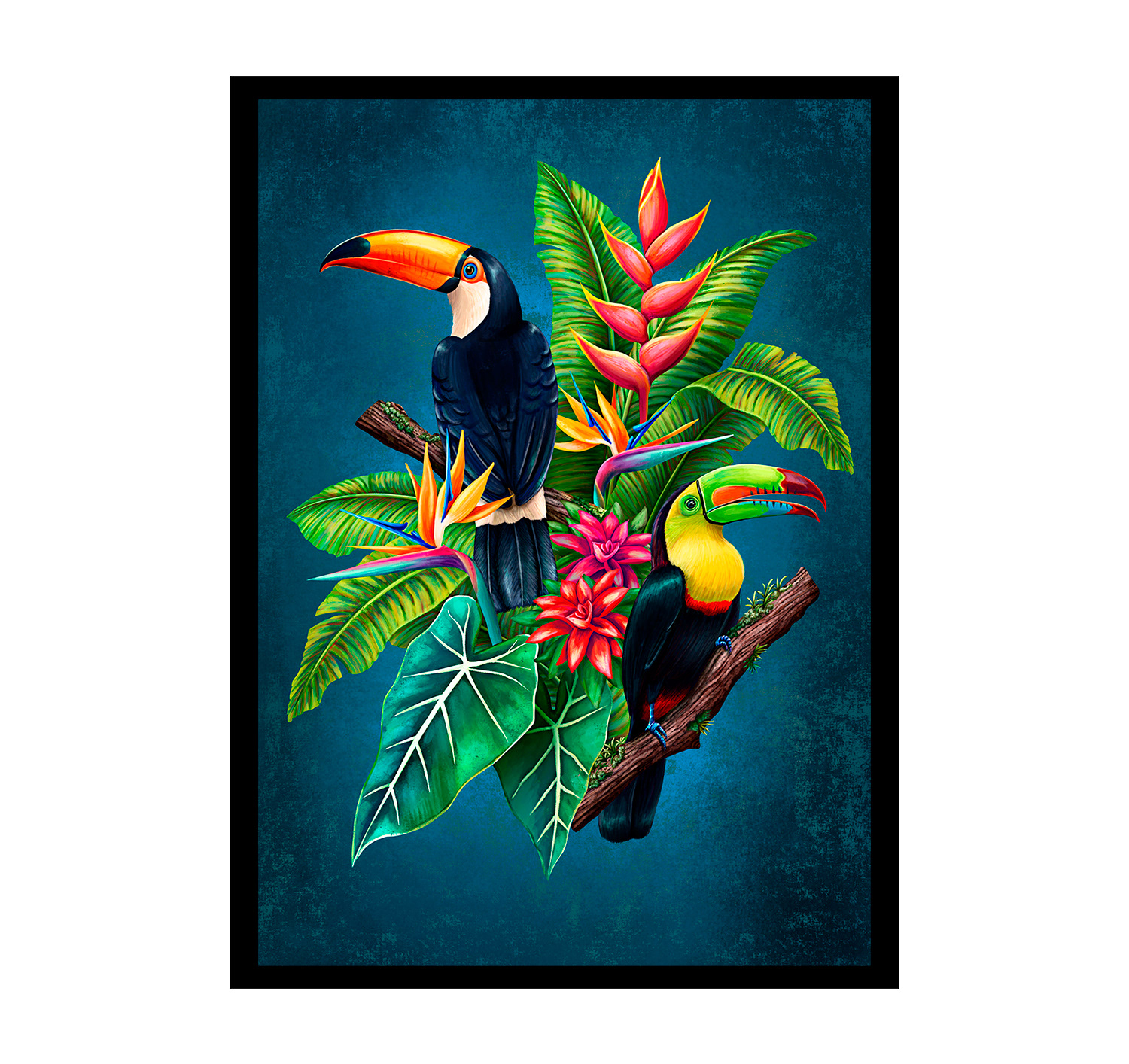 The illustration features a variety of blooming flowers, each one rendered with a bold and vivid color palette that perfectly captures the vibrancy of the natural world. Two toucans are also prominently featured in the scene, their colorful beaks and feathers standing out against the lush green foliage.